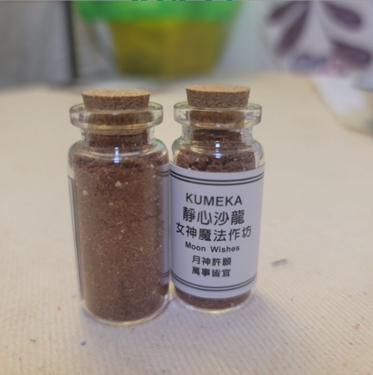 月神許願:混合檀香粉、蘇合香粉、薰衣草茉莉玫瑰粉、乳香粉、鳶尾花粉、槴子花粉、洛神花粉、黏粉、月神許願精油